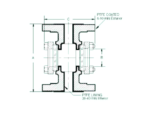 PTFE lined sight flow indicators have been designed for visually observing the flow of corrosive media. Except for the borosilicate glass, all wetted parts of the indicators are lined with PTFE. These units are ideal for viewing such corrosive fluids as acids, chlorides, sulfates, bleach solutions, solvents, and phenols. Each model can be provided with drip tubes. The Series FIF-PTFE lined is also available with flutter flow indicators. PTFE lined sight flow indicators are drilled to mate with ANSI Class 125/150 connections.