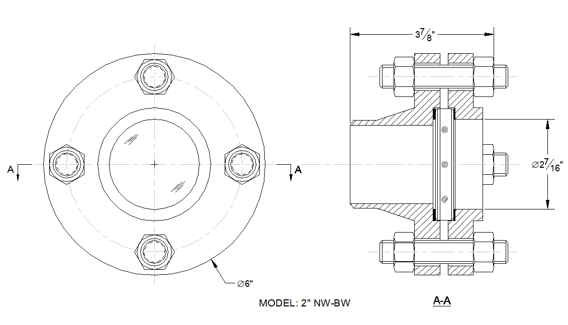 2″ ANSI B16.5 weld neck style sight glasses are designed for welding to a stub end pipe or may be supplied with a cut radius on the weld neck to straddle the side of a pipe. Each is rated for 150PSIG (10.3 Barg) at 300ºF (149ºC) with a tempered soda lime lens and 500ºF (260ºC) with a borosilicate lens.